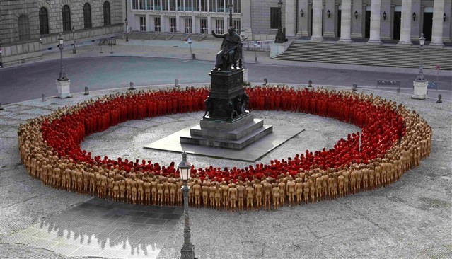 A grande marca do trabalho do fotógrafo norte-americano são as instalações que reúnem um grande número de pessoas nuas. Em Munique, o ponto de encontro foi a praça de Marstall. Com uma inovação em relação a outras instalações: as pessoas pintaram o corpo de amarelo e de vermelho.»