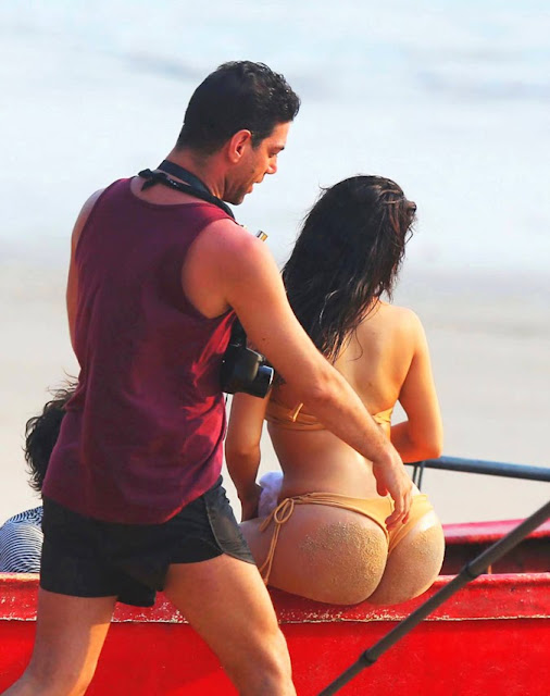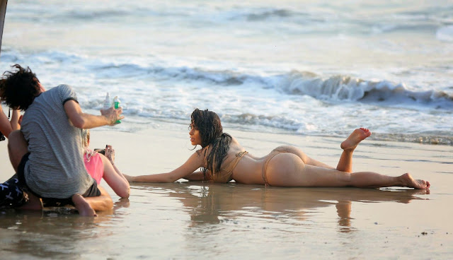 A socialite, companheira do músico Kanye West, aproveita as fotos para exibir com alguma predominância o seu famoso traseiro, tanto na areia como na borda de um barco vermelho. E se dúvidas existissem, parecem estar dissipadas: está completamente recuperada dos quilos que, naturalmente, engordou durante a gravidez, demonstrando até uma grande forma física.